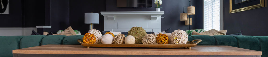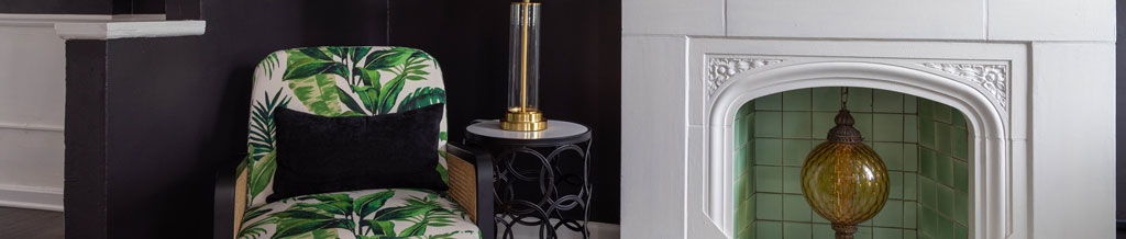 The inviting living area has a chenille kelly green sofa, two accent chairs with rattan arms for amble seating, two tall windows original to the structure bringing a vast amount of natural light, and a 43″ smart TV wall-mounted above a beautiful nonworking fireplace with access to all your favorite streaming apps – the perfect cozy place for a movie night.