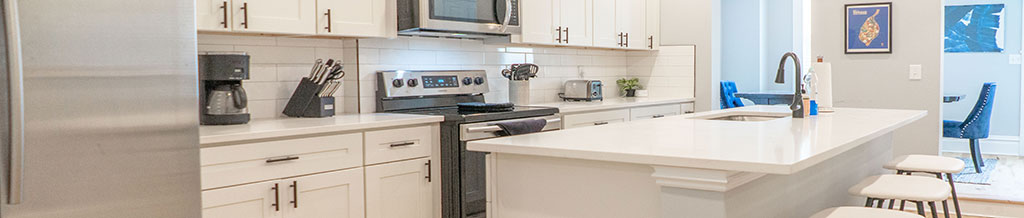 This unit has a convenient half bath on the first floor, and two more ensuite full baths with marble countertops and modern walk-in showers. Each bathroom is fully stocked with fluffy towels and all the essentials you may need during your stay.
