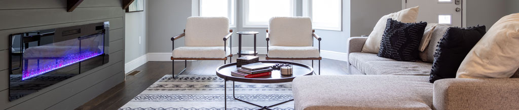 When you enter the home, you are greeted by this vast open-concept living room with a comfy sofa, two modern chairs, and a perfect setting for family gatherings. A 43″ SmartTV is mounted above the working fireplace mantel. Access to all your favorite streaming apps makes this room perfect for a cozy movie night.