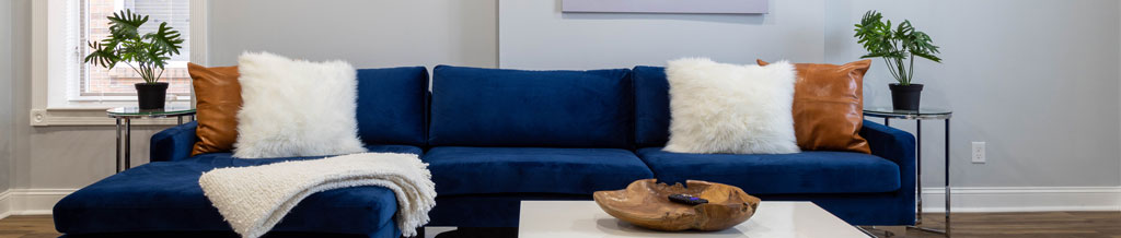 The living area is filled with a beautiful velour plush electric blue sectional framing the large 65″ wall-mounted TV with access to all your favorite streaming apps – the perfect cozy place for a movie night.