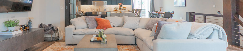 Take the modern-industrial staircase up to the spaciously open main floor where work ends and enjoyment begins!! Natural light abounds, and you’ll especially love the comfy and oversized sectional sofa paired with a giant SmartTV. Movie night anyone??