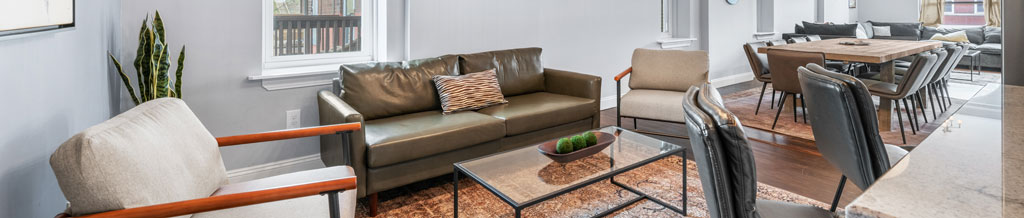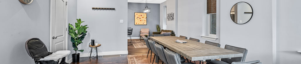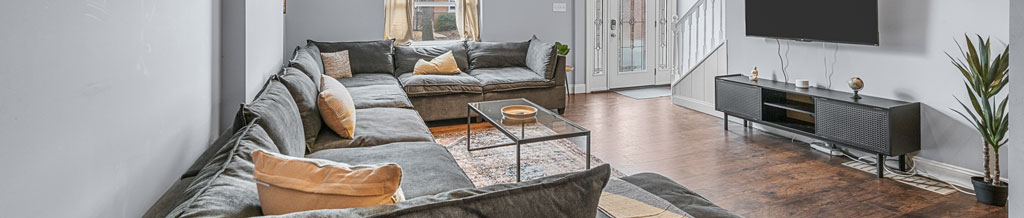 A plush large sectional sofa awaits in the front living area, promising comfort and respite after a long day. A wall-mounted 55″ Smart TV becomes your gateway to entertainment, granting seamless access to your favorite streaming apps and movies. Whether it’s a cozy movie night or a lively sports game, this space is designed for relaxation and enjoyment.