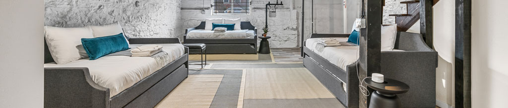 Three trundle beds (6 twin beds) can accommodate guests at night, and the lounge area can be comfortable during the day. The basement features an incredibly convenient full-size bathroom with a single vanity, a tub/shower combo, and a large closet. Let’s not forget a 55″ smart TV transforming this space into a home theater.