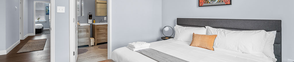 Let’s explore the bedrooms on the second floor. The Primary Suite features a king-size bed adorned with premium quality linen and bedding with ample storage space, ensuring you can neatly organize your belongings. There’s a wall-mounted Smart TV for entertainment—perfect for winding down after a long day. The modern ensuite bathroom boasts two vanities and a spacious walk-in shower with a sliding glass door. Families with little ones will appreciate the convenience of the provided crib and pack-n-play. Primary Suite isn’t just a room—it’s your oasis, a retreat where comfort and convenience intertwine!