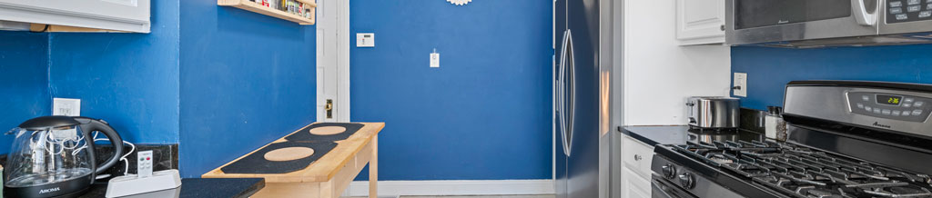 Bedroom #1 offers a queen-upholstered bed with two side tables, lamps, and beautiful custom Roman shades for a restful night’s sleep! Bedroom #2 offers a king-size bed with a head and footboard and a matching nightstand and dresser. A sizable closet to store your belongings. Adjacent to the bedroom is a spacious lounge room/living space with a couch, a wall-mounted smart TV, a desk, and an office chair, perfect for catching up on all your work emails outside the office! The second full-size bathroom is tucked in the back with a w/single vanity and a tub/shower combo stocked with fresh, clean towels.